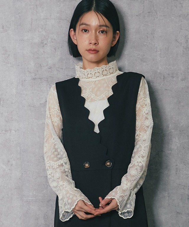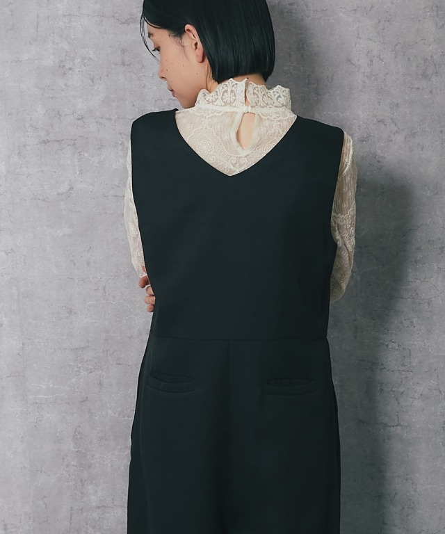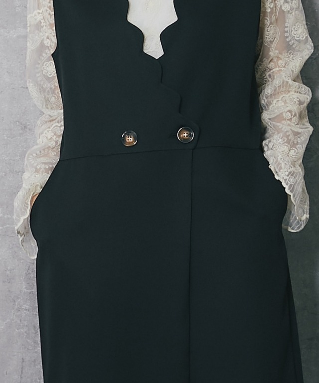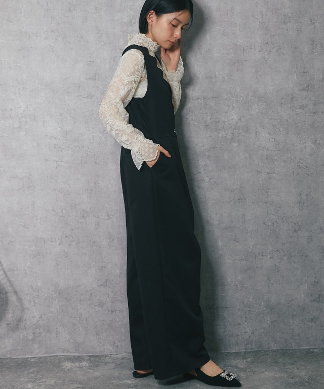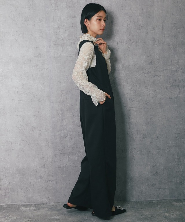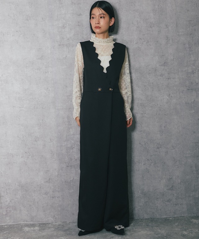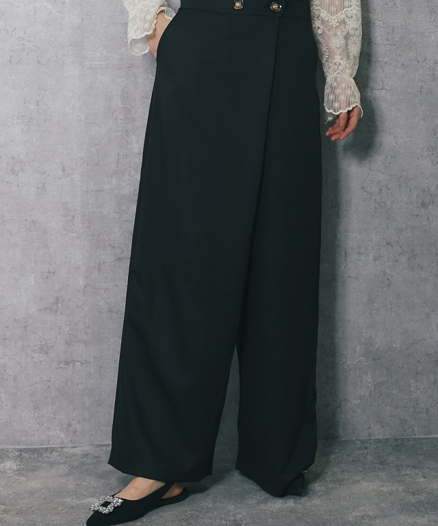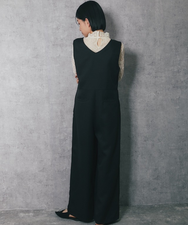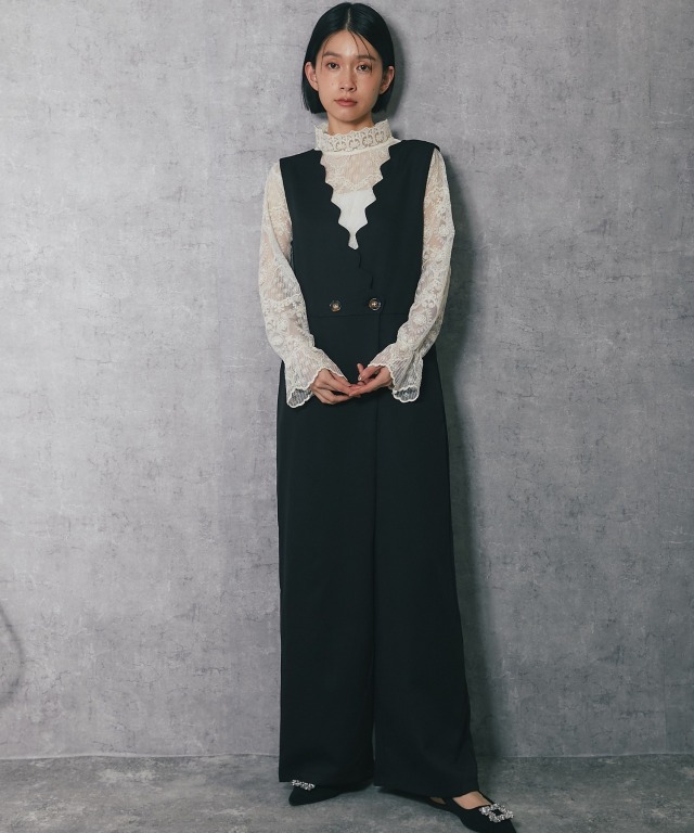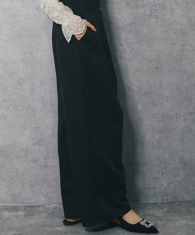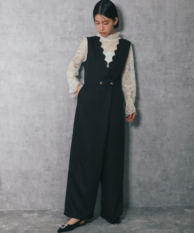 深めのVネックデザインで、スカラップカットが施されており、フェミニンな印象を与えます。 斜めに重なるラップ風のデザインにやや大きめのボタンがアクセントになり、シンプルながらも洗練された印象をプラス。 ボトム部分はゆったりとしたワイドパンツ仕様。脚のラインを拾わず、体型カバー効果が期待できます。 さらに、ストレートなシルエットが縦のラインを強調し、スタイルアップ効果も◎ フォーマルな場面はもちろん、インナーを変えることでカジュアルにも着こなせるアイテムです。 ■カラー ブラック ■スタイリング レースブラウスやシンプルなインナーを合わせて、パンプスを履けばオフィスやフォーマルなシーンに。 シンプルなTシャツやリブニットをインナーにし、スニーカーやローファーを合わせることで、こなれたカジュアルスタイルに。 幅広いシーンで活躍する万能アイテムです。 ■商品のディテール ※透け感:なし ※光沢感:なし ※伸縮性:なし ※裏地:なし ※ポケット:あり ※ファスナー:あり ※素材:ポリエステル 100% ■こんなシーンにおすすめ 結婚式の二次会、披露宴やパーティーなどのフォーマルシーンはもちろん、 謝恩会、食事会、入園式、入学式、卒園式、卒業式、また参観日や学校行事にもおすすめです。 |