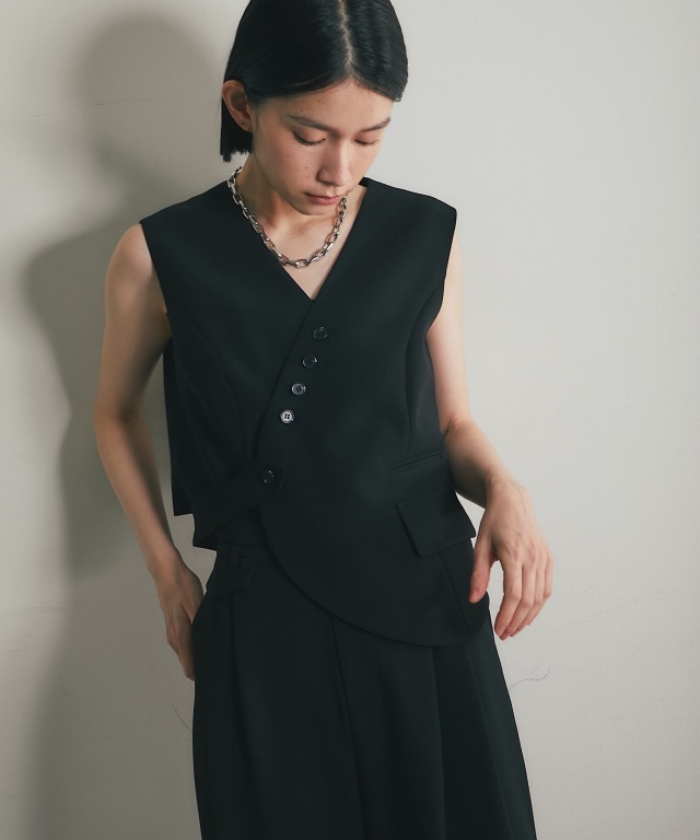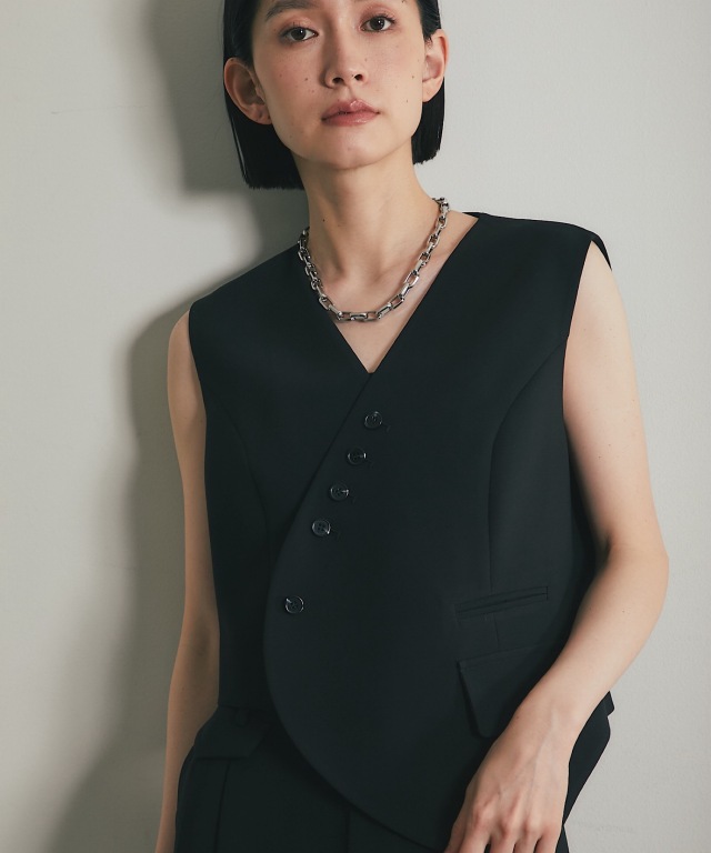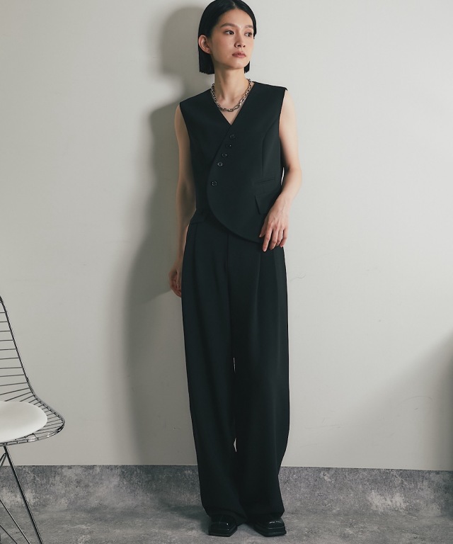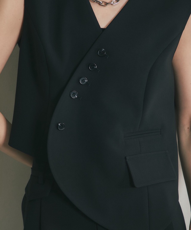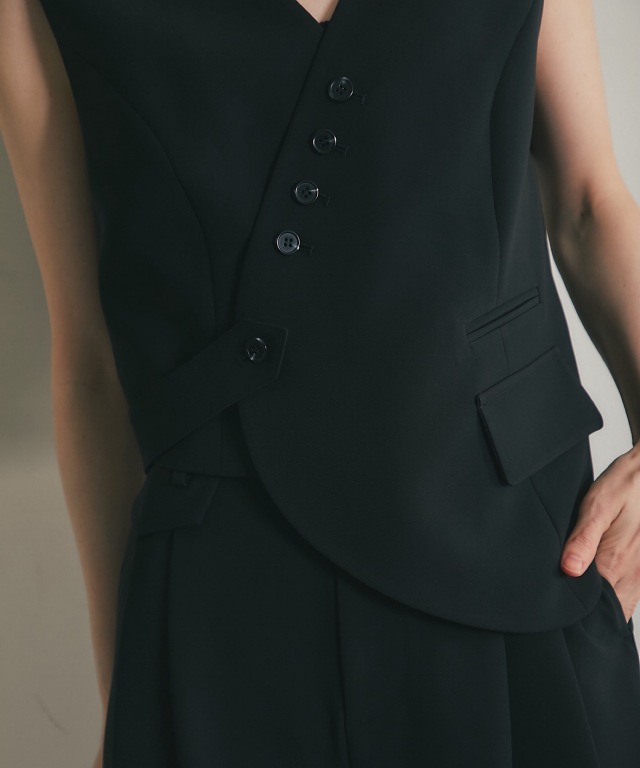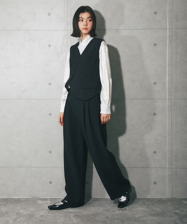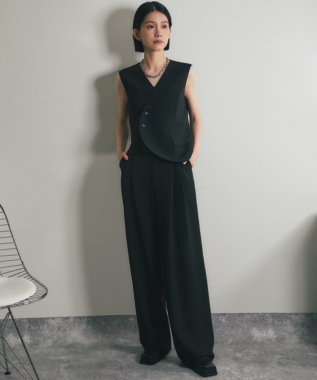 アシンメトリーなデザインが特徴のジレ&パンツ2点セットスーツ