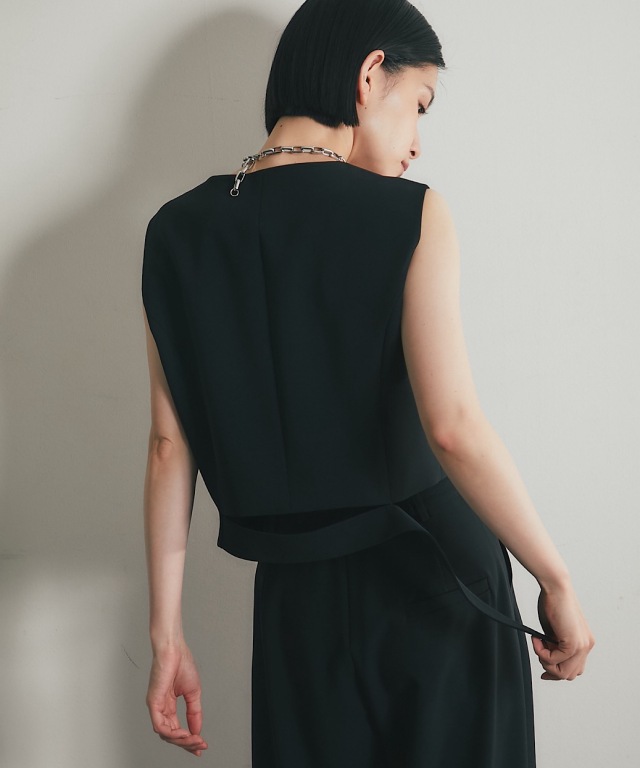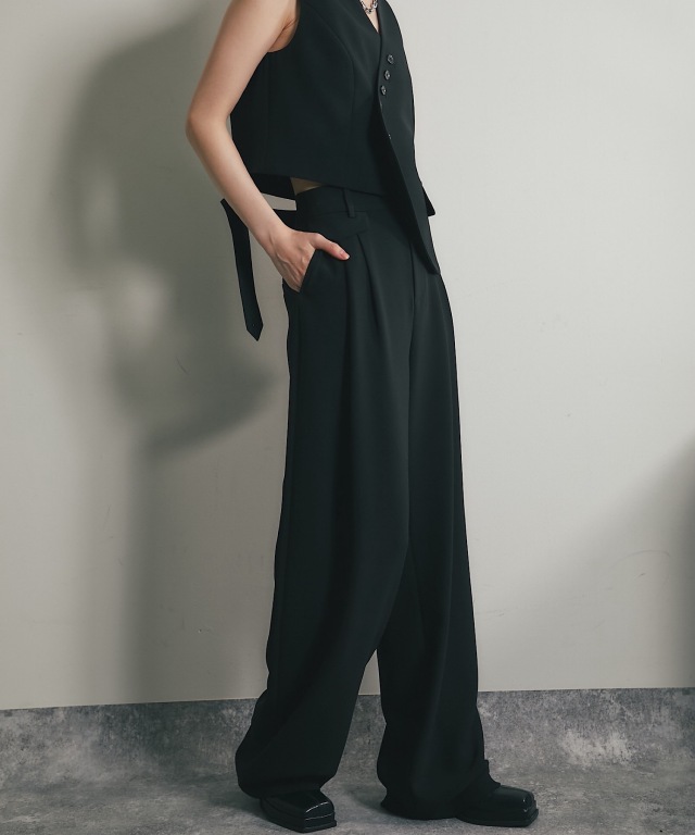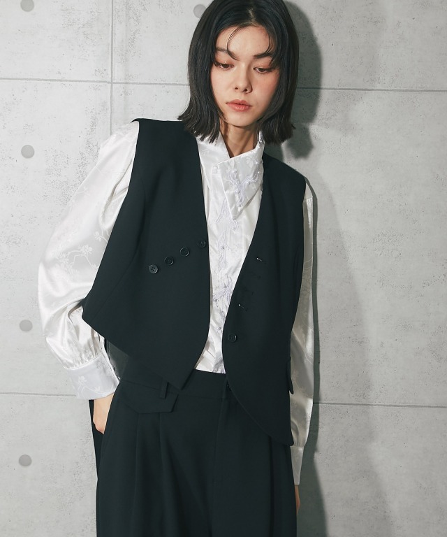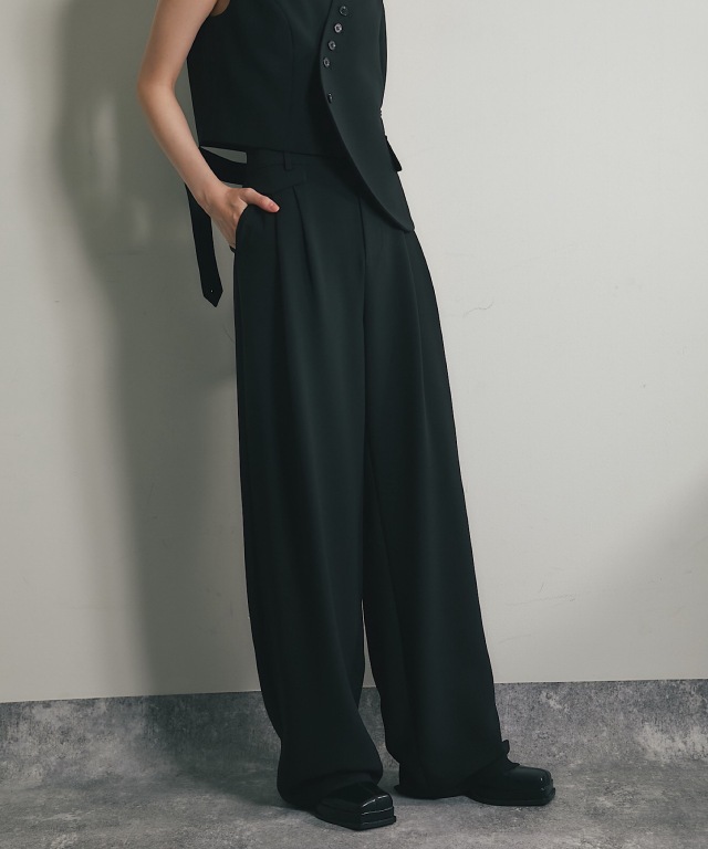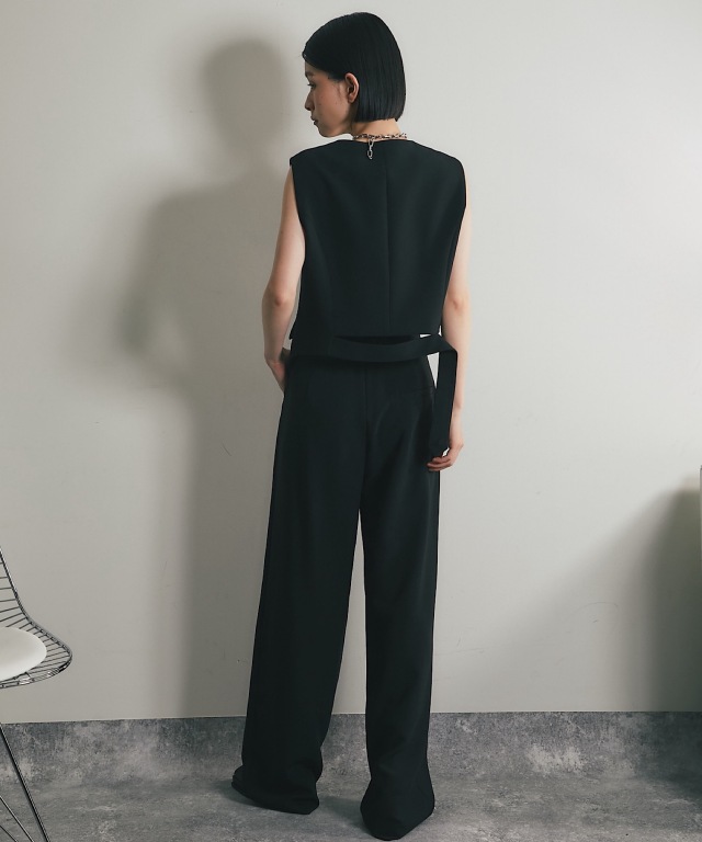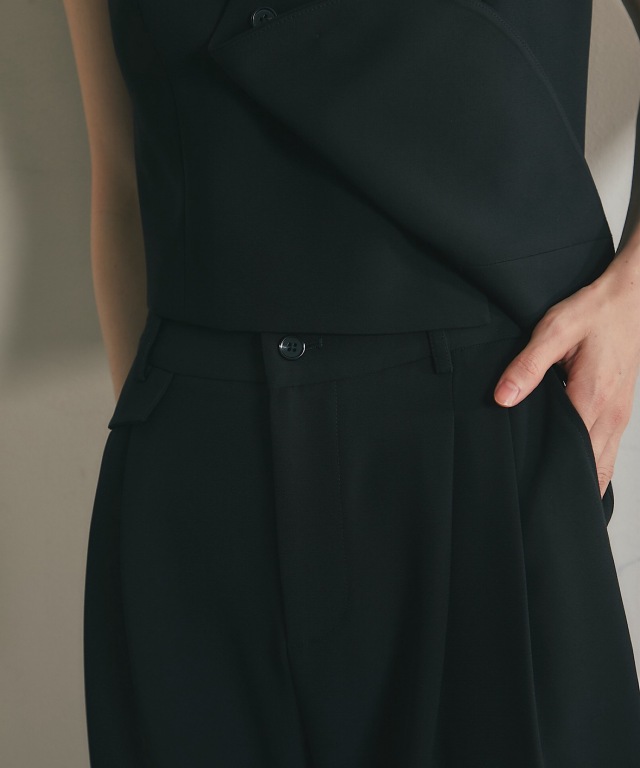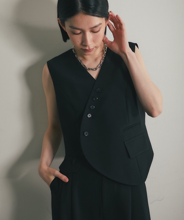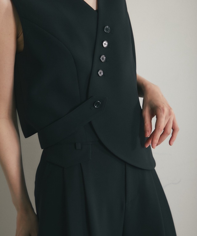 アシンメトリーなデザインが特徴のジレ&パンツ2点セットスーツ